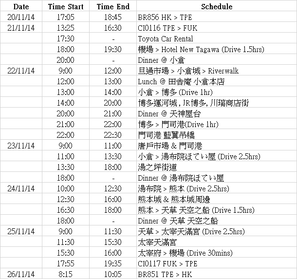福岡第一天的行程,很簡單就完結了,接下來的行程安排是這樣: